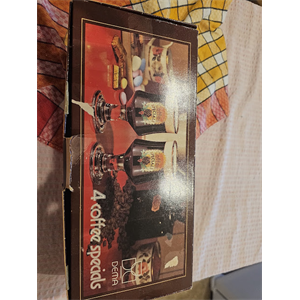This is a set of four Dema Irish Coffee glasses with a vintage retro style. Each glass features a gold rim and stem with the Dema logo on them. The set includes four glasses designed for serving Irish